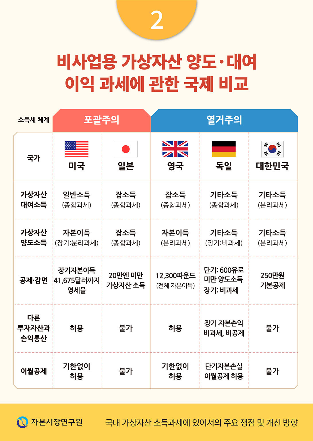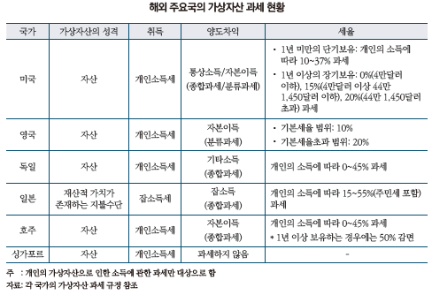 아래의 표는 여러 나라의 가상자산 과세 방식을 비교한 내용이에요.