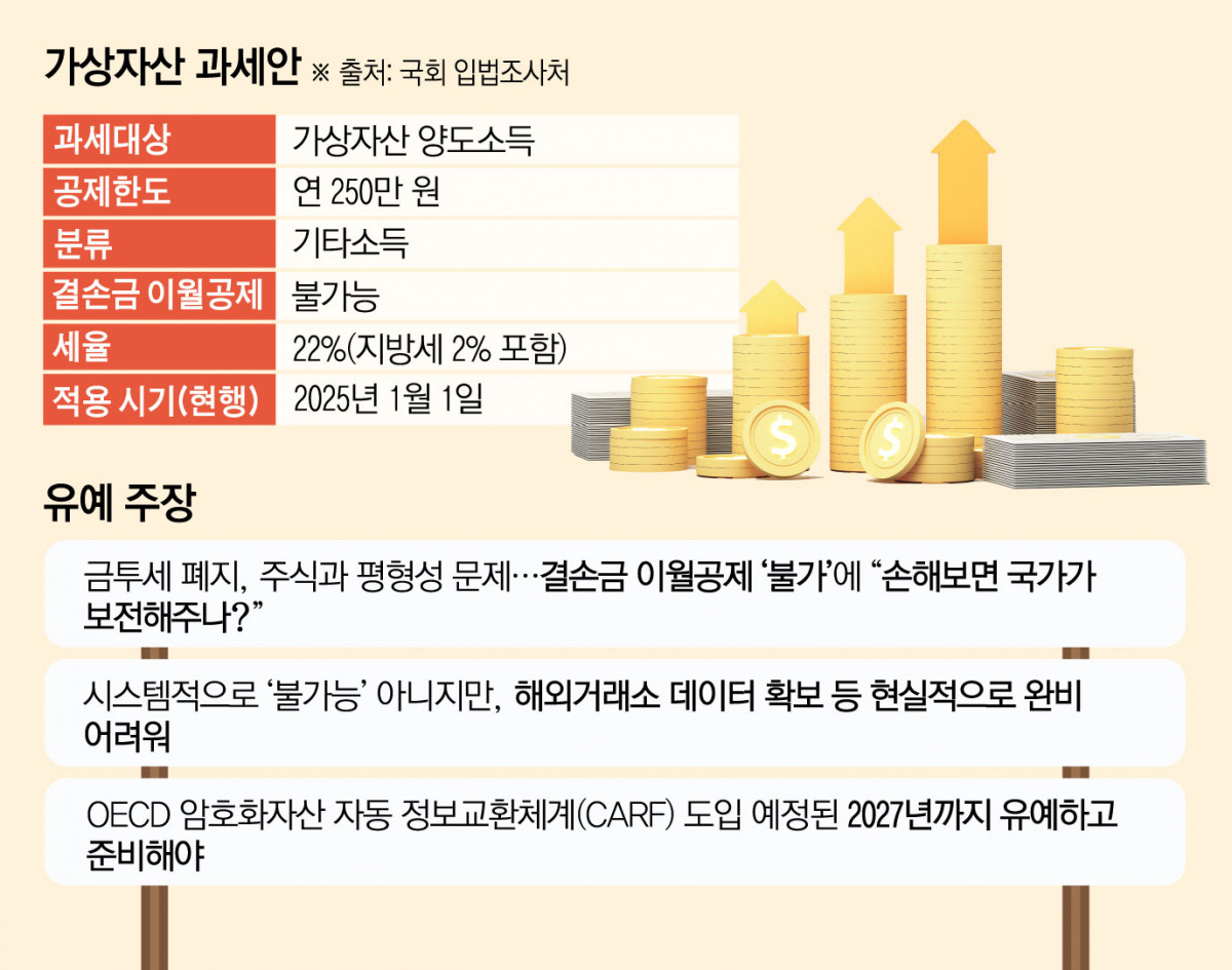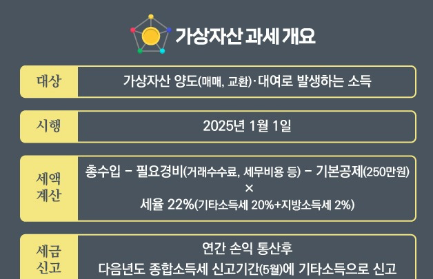 한국에서는 2025년 1월 1일부터 가상자산에 대한 과세가 시행될 예정이에요. 이때부터는 가상자산 거래에서 발생하는 소득이 기타 소득으로 분리 과세되며, 기본 공제액은 250만 원이에요. 즉, 250만 원을 초과하는 소득에 대해서는 22%의 세율이 적용된답니다.