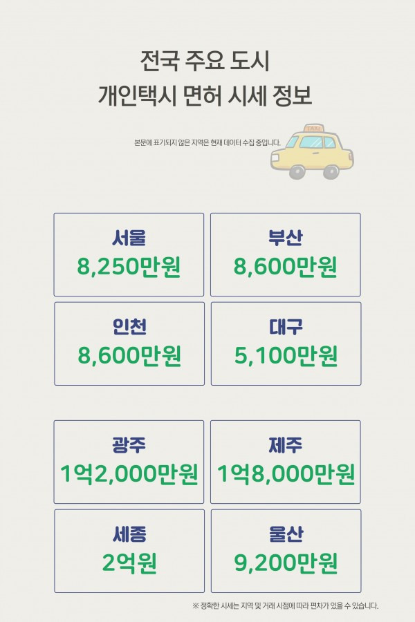 개인택시의 시세는 지역에 따라 다르게 형성됩니다. 아래는 주요 도시의 개인택시 평균 시세를 정리한 표입니다.
