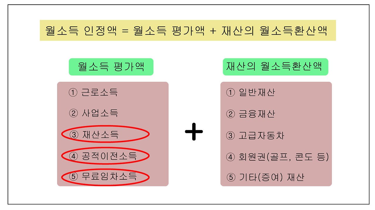 - 재산의 월소득환산액 = (재산 가치 - 기본재산공제) × 소득환산율 이렇게 계산된 월소득 평가액과 재산의 월소득환산액을 합산하여 최종 소득인정액을 구하게 됩니다.