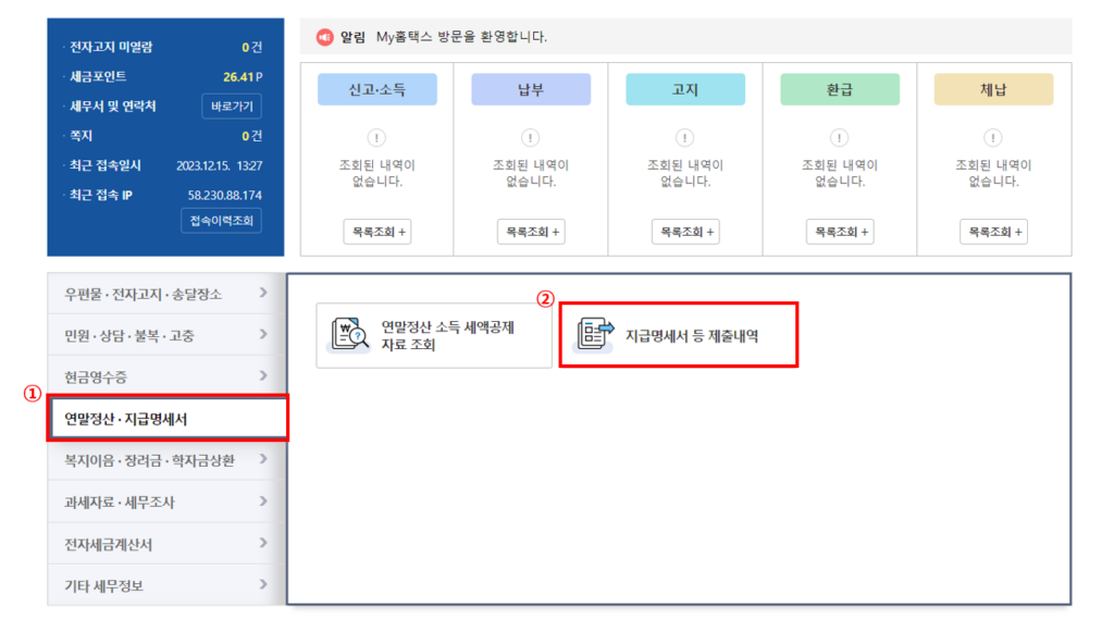 - '지급명세서' 선택 : 지급명세서 메뉴를 선택하고, '근로소득 원천징수영수증'을 클릭해요.