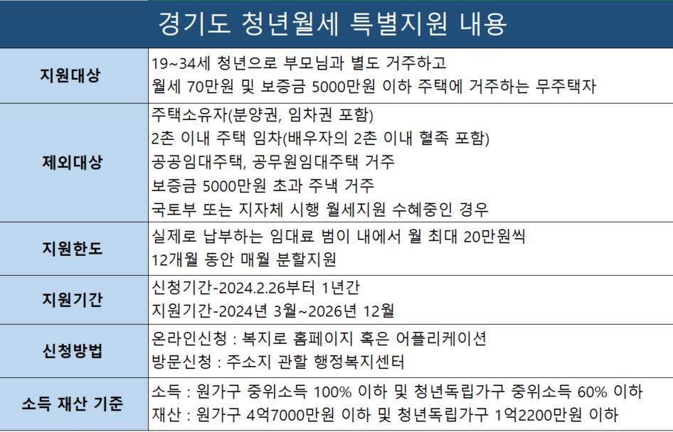 각 지역에서는 청년과 신혼부부를 위한 다양한 임대료 지원 프로그램을 운영하고 있습니다. 예를 들어, 경기도에서는 만 19세에서 34세의 청년들이 신청할 수 있으며, 월소득이 700,000원이 넘지 않아야 합니다. 주택의 가격이 5천만 원 이하인 경우에 해당되며, 지원은 2024년 3월부터 2026년 12월까지 진행됩니다. 아래의 이미지를 통해 자세한 내용을 확인할 수 있습니다.