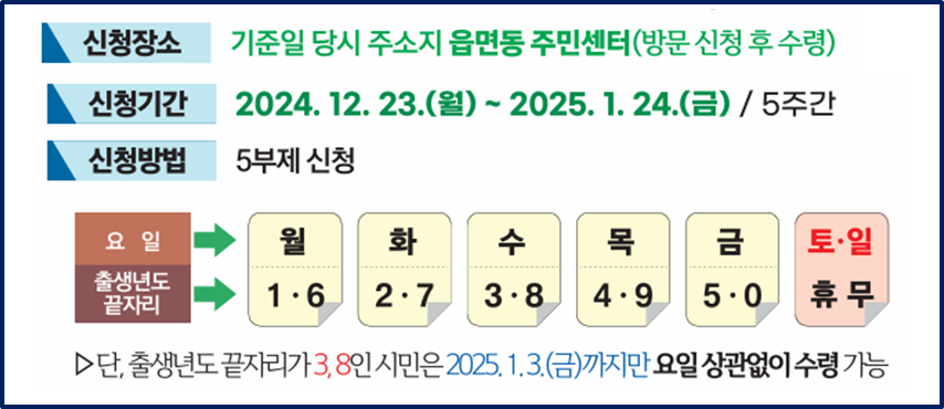 신청 방법은 간단합니다. 정해진 신청 기간 동안 주소지 읍·면·동 주민센터를 방문하여 신청하면 됩니다. 특히, 혼잡을 피하기 위해 출생 연도 끝자리에 따라 5부제로 진행되니, 자신의 출생 연도에 맞춰 방문하는 것이 좋습니다.