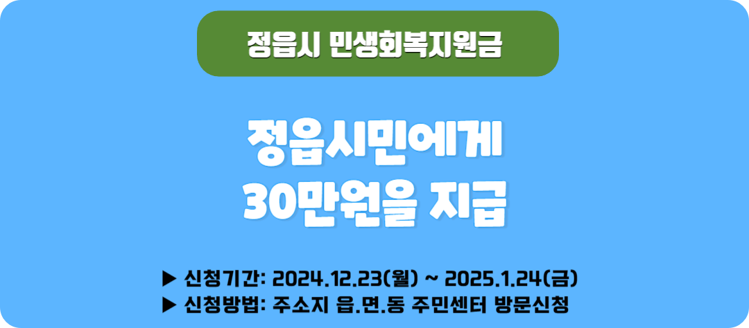 정읍시는 경제적 어려움을 겪고 있는 시민들을 위해 민생회복지원금을 지급합니다. 이 지원금은 시민들이 생활에 필요한 기본적인 비용을 충당할 수 있도록 돕기 위해 마련된 제도입니다. 지원금은 1인당 30만 원으로, 정읍시에 거주하는 모든 시민이 신청할 수 있습니다.