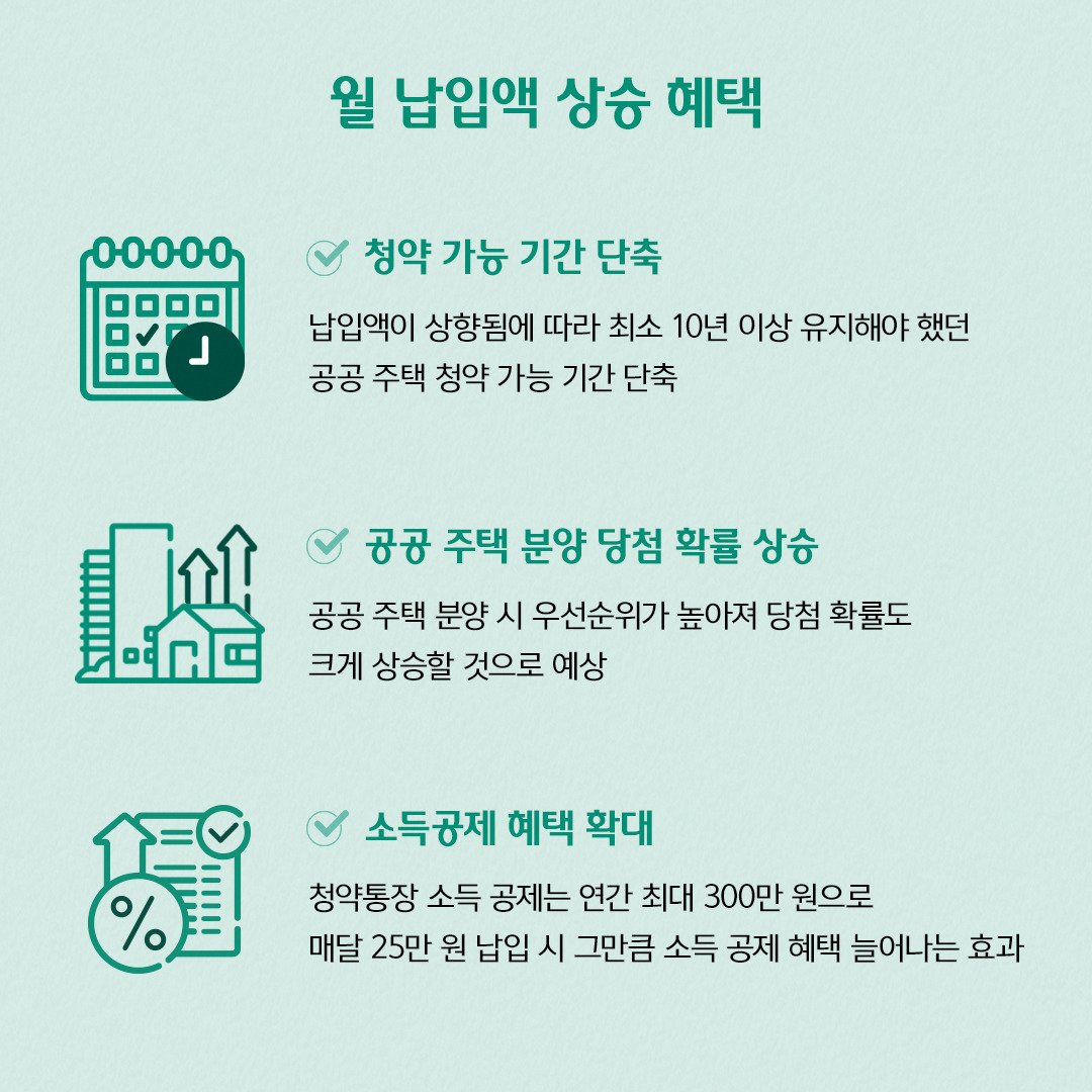 - 높은 당첨 확률 : 월 25만원을 납입하면 청약 통장 가입 기간이 단축되고, 당첨 확률이 높아집니다. 특히 공공주택에 대한 우선권이 주어지기 때문에 무주택자에게 유리합니다.