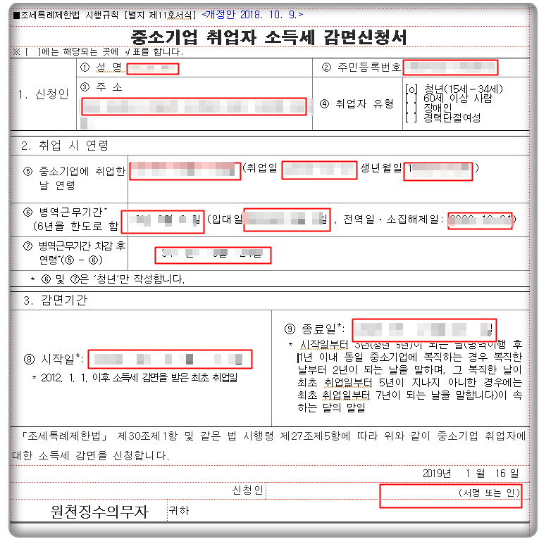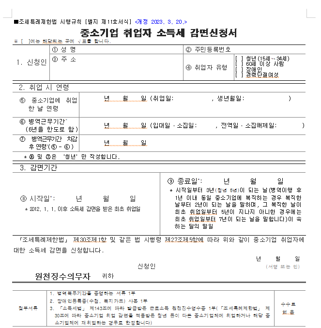 신청서를 작성할 때는 개인 정보와 취업 정보를 정확히 기재해야 합니다. 예를 들어, 이름, 주소, 주민등록번호, 취업 시작일, 회사명 등을 포함해야 하죠. 아래 이미지는 '중소기업 취업자 소득세 감면신청서'의 예시입니다.