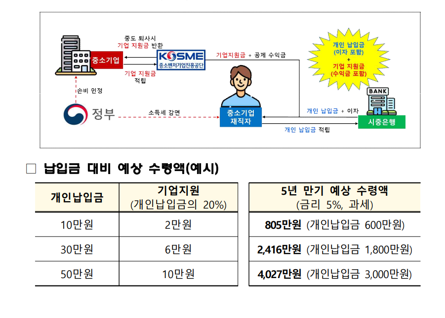 - 저축 금액 : 매달 100,000원에서 500,000원까지 저축할 수 있으며, 기업에서 20%의 지원금을 제공합니다.