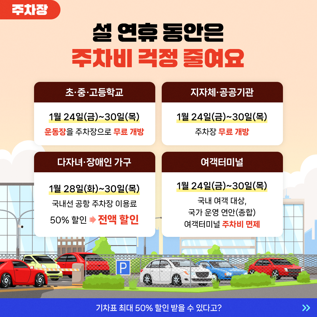 2025년 설 연휴 동안 주차료 할인 정보도 주목할 만합니다. 공공기관과 교육기관은(초등,중,고등) 1월 24일부터 30일까지 무료 주차를 제공하며, 어린이와 장애인을 동반한 가족은 1월 28일부터 30일까지 국내 공항 주차장에서 50% 할인 혜택도 받을 수 있어요. 주차 공간을 찾는 것이 어려운 연휴 기간에 매우 유용한 정보죠.