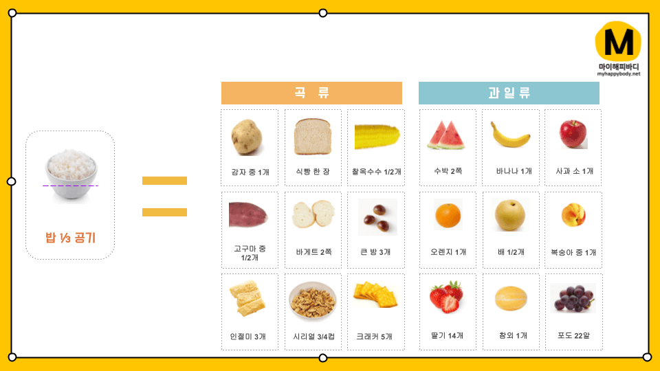 - 채소와 과일 : 매 끼니마다 다양하게 섭취하기