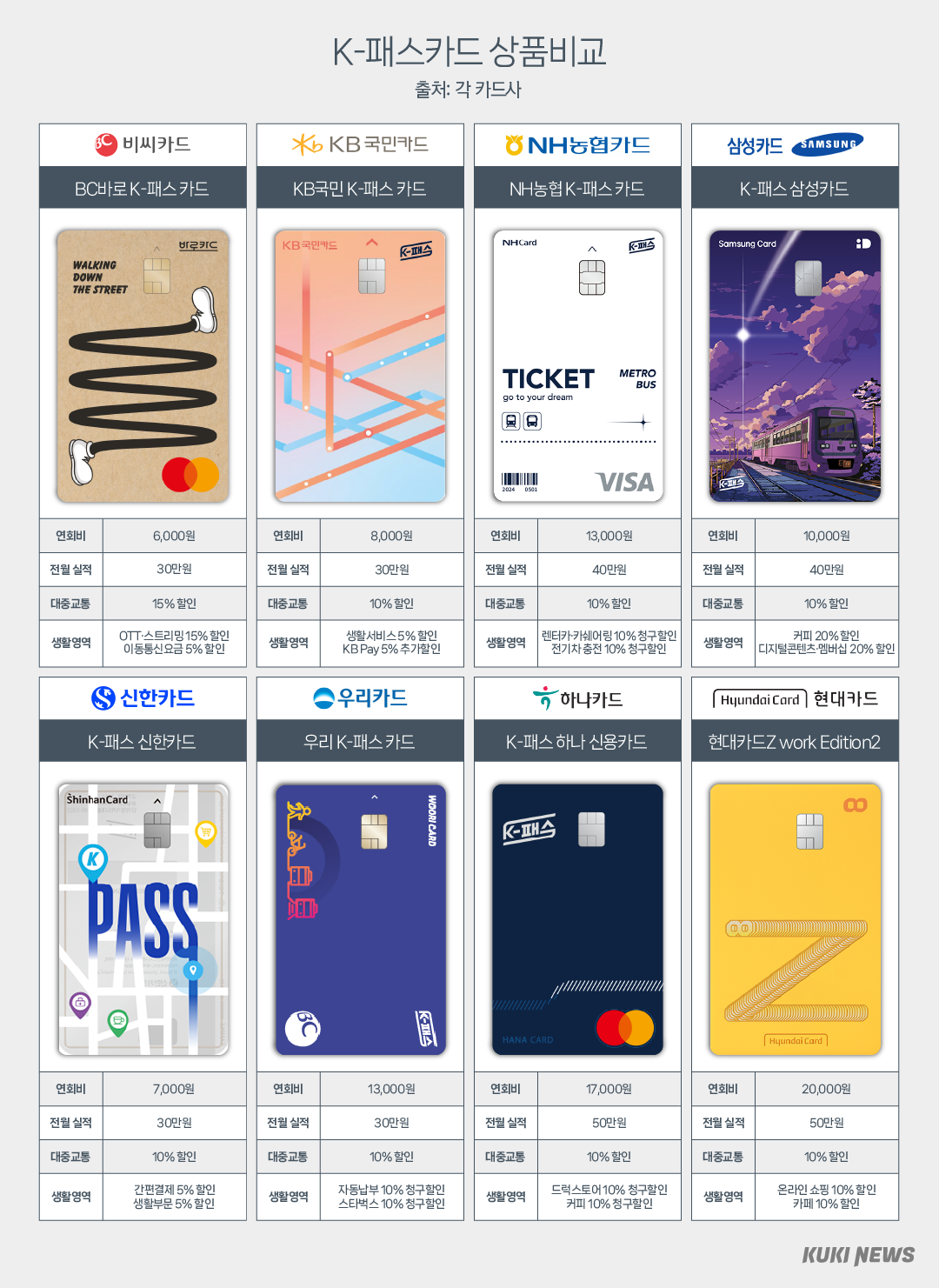 K-패스 카드는 일반적으로 연회비가 다소 낮은 편인데, 어떤 카드는 특정 조건을 충족하면 연회비가 면제되기 때문에, 그 부분도 체크해보시면 좋겠어요. 그러니 아래 이미지를 통해 각 카드의 혜택을 비교해보세요.